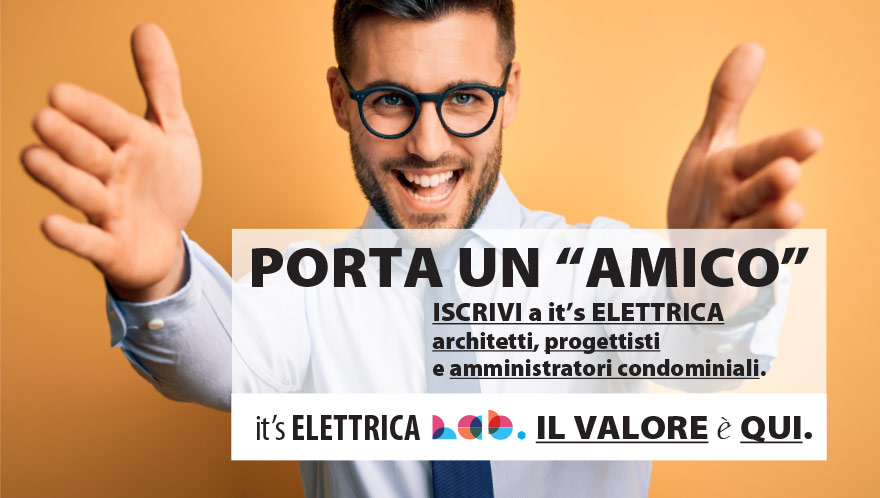 Se sei un cliente Comoli Ferrari ed effettui uno dei percorsi di it’s ELETTRICA Lab, invitando e facendo iscrivere a it’s ELETTRICA tre nuovi professionisti, tra architetti, progettisti e amministratori di condominio, potrai ottenere 1 vantaggio EXTRA sul livello raggiunto, spendibile per acquisire le interessanti opportunità di valore predisposte per chi partecipa all’evento.